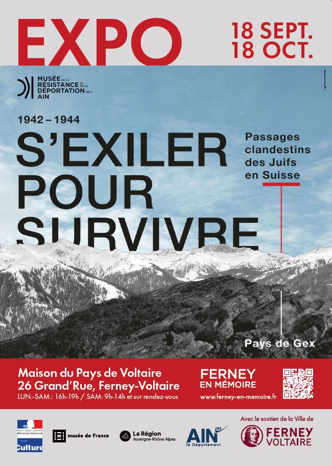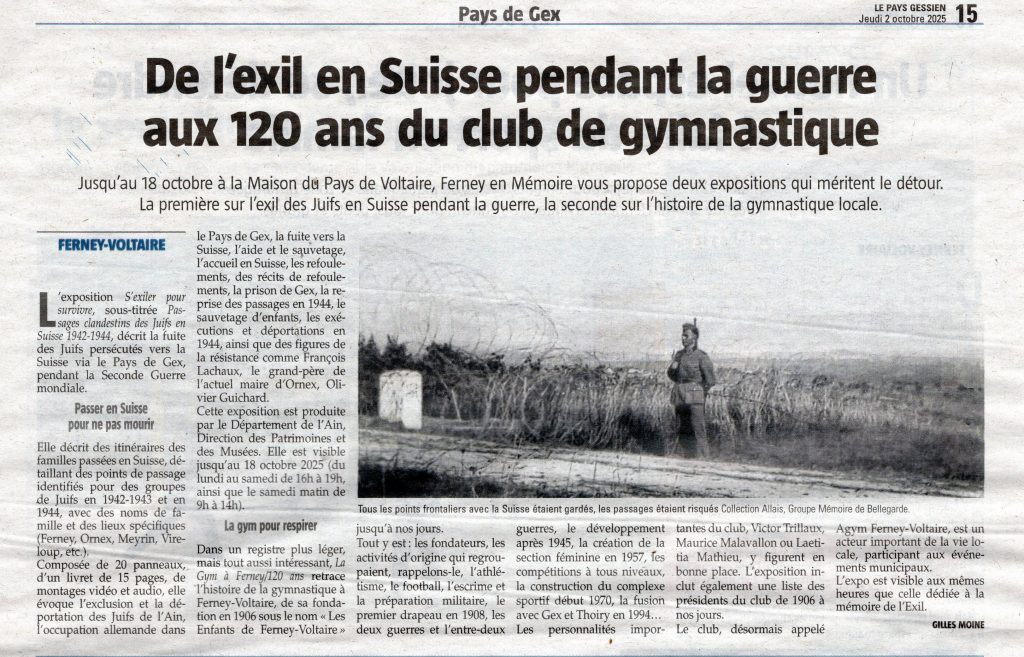 Jusqu’au 18 octobre à la Maison du Pays de Voltaire, Ferney en Mémoire vous propose deux expositions qui méritent le détour.La première sur l’exil des Juifs en Suisse pendant la guerre, la seconde sur l’histoire de la gymnastique locale. L’exposition S’exiler pour survivre, sous-titrée Passages clandestins des Juifs en Suisse 1942-1944, décrit la fuite des Juifs persécutés vers la Suisse via le Pays de Gex, pendant la Seconde Guerre mondiale.